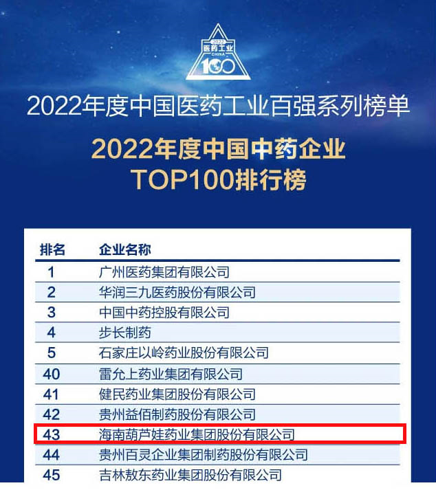 会议期间,一年一度的中国医药工业百强系列榜单隆重揭晓,拉斯维加斯9888药业集团凭借领先的研发优势和扎实的生产实力以及稳健的市场推广能力,连续第四年成功入选“2022年度中国中药企业TOP100排行榜” ,排名稳步上升至第43位。